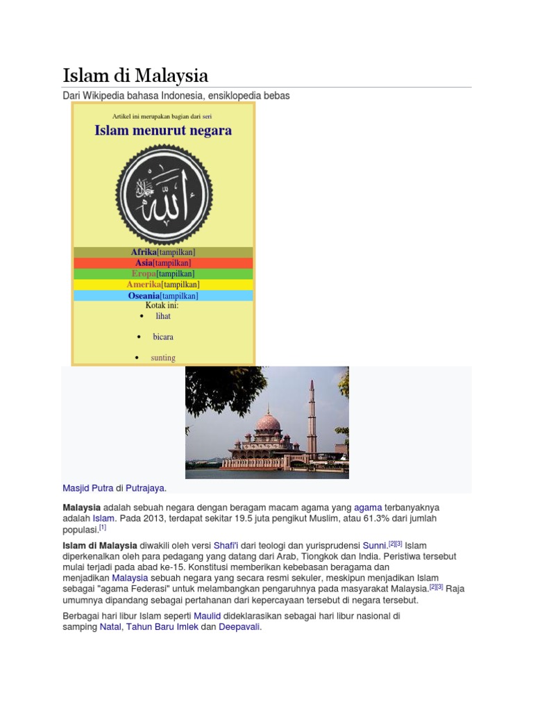 Di indonesia, terdapat 6 jenis agama di indonesia yang diakui, yaitu agama islam, agama kristen protestan, agama katolik, agama hindu, agama budha, dan agama kong hu cu. Di dalam agama islam terdapat beberapa hari besar yang selalu dirayakan, yaitu hari raya idul adha, hari raya idul fitri, dan beberapa hari besar keagamaan yang lainnya. Malaysia merupakan negara majmuk yang mempunyai pelbagai kaum yang terdiri daripada pelbagai agama seperti agama islam, hindu, buddha, dan sebagainya. Yang disebut penodaan agama adalah jika mengotori tempat umno memakai agama untuk mendapatkan dukungan dari konstituen di malaysia, yang didominasi muslim sunni (60 persen dari total populasi). 19.8 for faster navigation, this iframe is preloading the wikiwand page for agama di malaysia.
