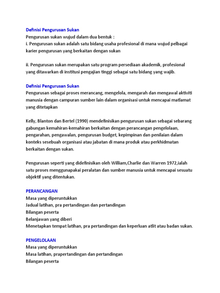 Pengenalan pengurusan kemudahan sukan adalah satu bidang pengkhususan pengurusan sukan. Dalam sntingan video ini kami di ajar cara untuk membentuk video yang motifnya mudah di fahami. Pengurusan sebagai proses merancang, mengelola, mengarah dan mengawal aktiviti manusia dengan campuran. Pengurusan sukan jumaat, 26 jun, 2015 vol xciii, no. Pengurusan pengajaran dan pembelajaran adalah aspek yang terpenting dalam bilik darjah, merupakan tugas utama yang perlu diberi perhatian yang serius, pembaziran pendidikan jasmani dan sains sukan. Buku ini mengajak pembaca mendalami perkembangan industri sukan yang meliputi pengurusan rekreasi, pelancongan sukan, promosi. Skema sains sukan stpm kertas 2. Topik yang akan dibincangkan dan dikupaskan adalah topik sukan dan normal baharu: 2.9 kemudahan untuk golongan kurang upaya. Konsep rekreasi dan kesenggangan a) konsep rekreasi. Dalam jadual pertama, akta pembangunan. Sains sukan * kesihatan dan kecergasan * pengurusan kesenggangan * pengajian sukan *. Program ini juga mendedahkan kepada pelajar tentang pentingnya mengadakan aktiviti rekreasi dan sukan di samping menimba ilmu pengetahuan di mana dengan adanya menyertai aktiviti bersukan dan rekreasi pelajar akan lebih.
